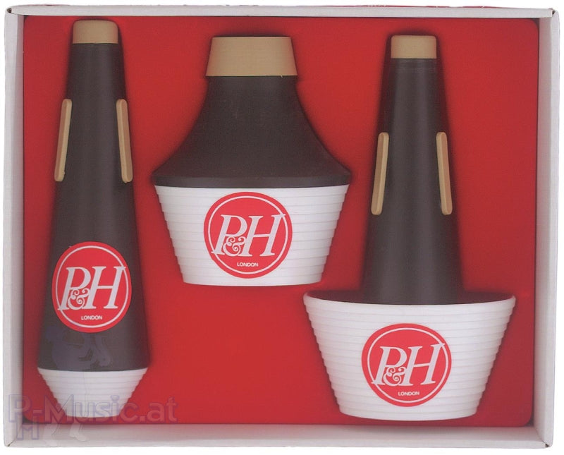 This is a set of three lightweight polyester plastic mutes for trumpet. By P&H London, this set includes a straight mute, cup mute, and Harmon-style wah-wah mute, which will set you up for most any playing situation. Packed in an attractive display box, it's the perfect gift for the stopthatpracticing! beloved trumpeter in your life. The large red labels stick only partially to the mutes, so they'll likely be unlabeled once you use them a bit.