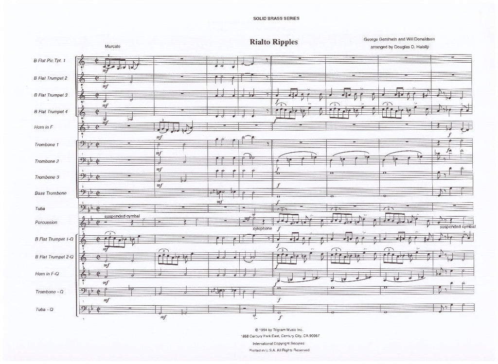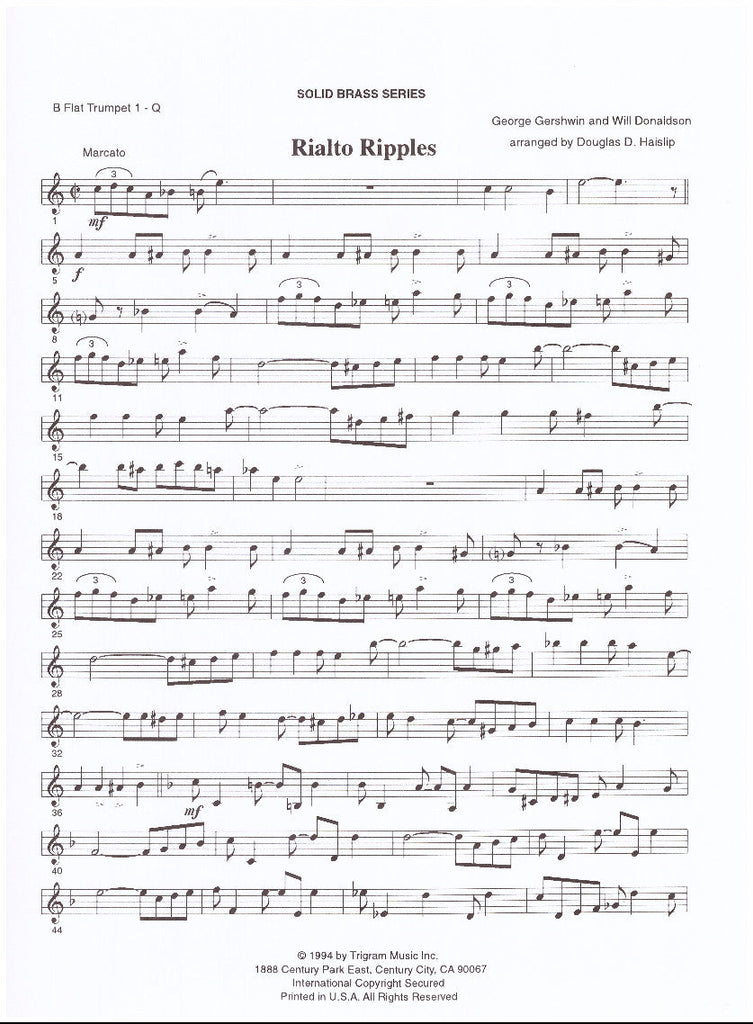 George Gershwin's 1917 novelty rag "Rialto Ripples" was his first published instrumental, and was a commercial success. It has all the hallmarks of Gershwin's piano style, with stride left hand patterns and ragtime syncopation typical of that era.