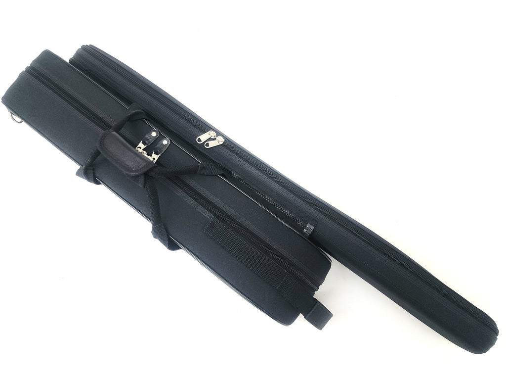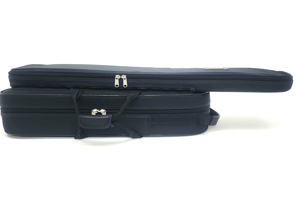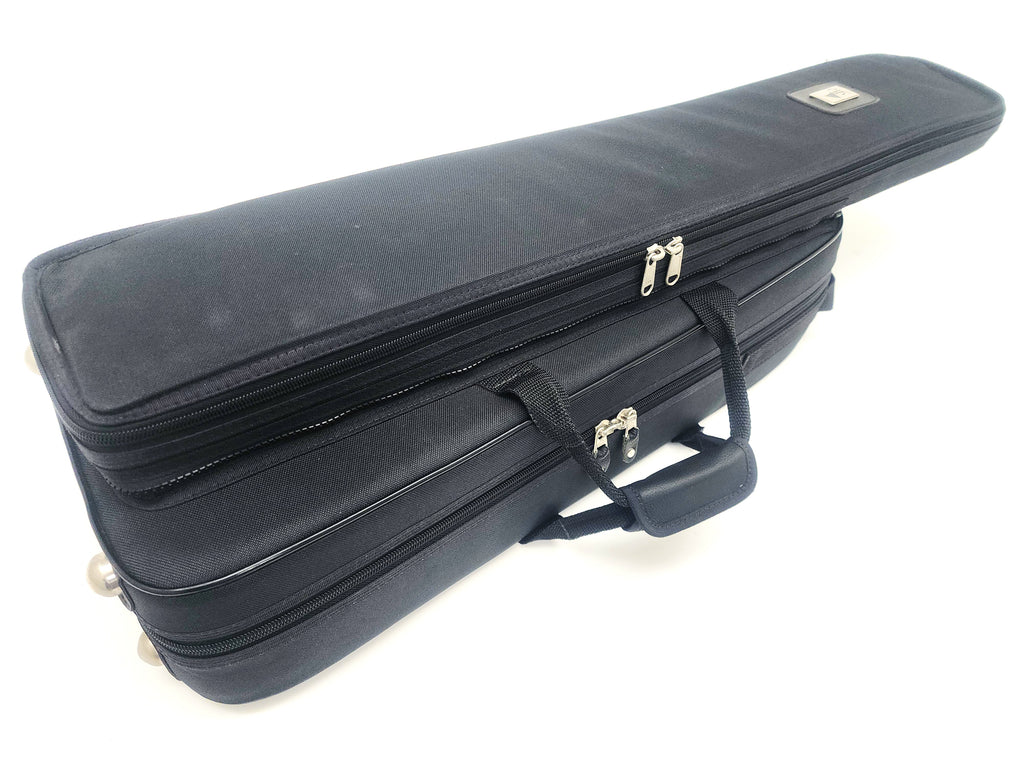 This is a very small fiberglass travel case for a tenor trombone with F-attachment and screw bell flare, made by Marcus Bonna in Brazil. The hand slide fits in its own case which unzips from the main case. To make it work, you remove the F-attachment crook and store it in the compartment underneath the trombone body. It's unusual, but when you need to be really small, this does it. I don't know which instruments it does and does not fit exactly. Most F-crooks will fit in the compartment. Important: make sure the F-attachment outside sleeves of your horn don't protrude past the tuning slide bow or it won't fit. Conn 88HO/88HTO is a problem, 88H closed wrap is fine. Back 42BO and Shires are fine. Photos show a Michael Rath R4F.