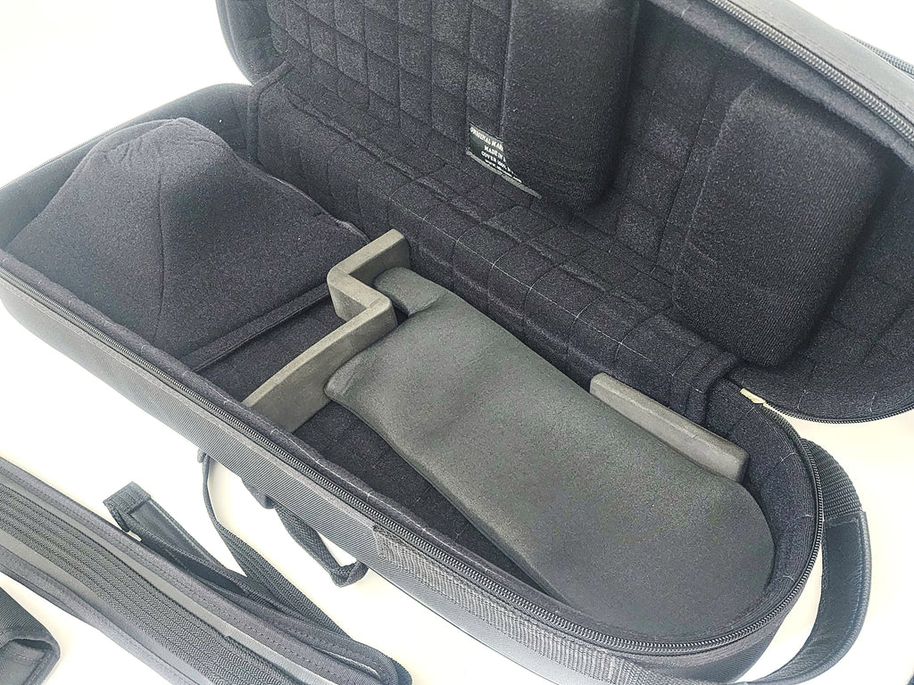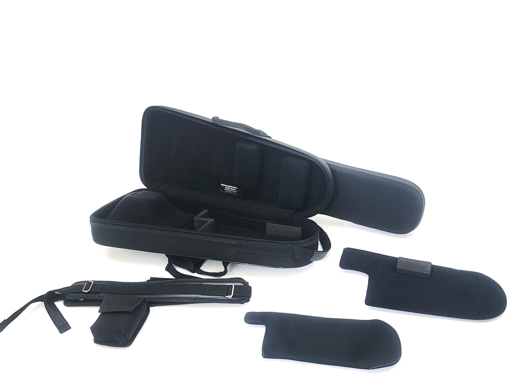 In black nylon with fiberglass shell. Includes shoulder straps and mouthpiece pouch.