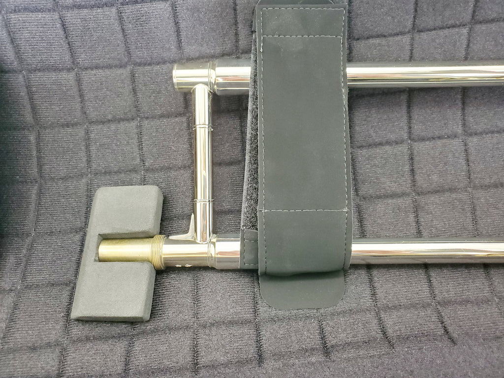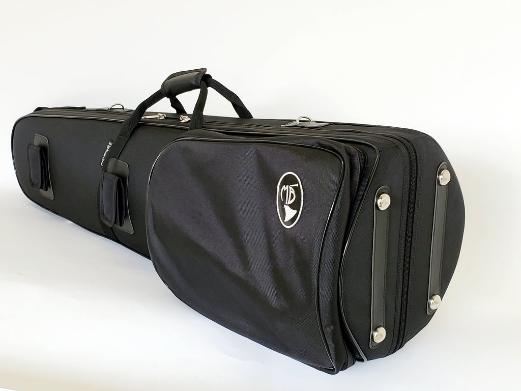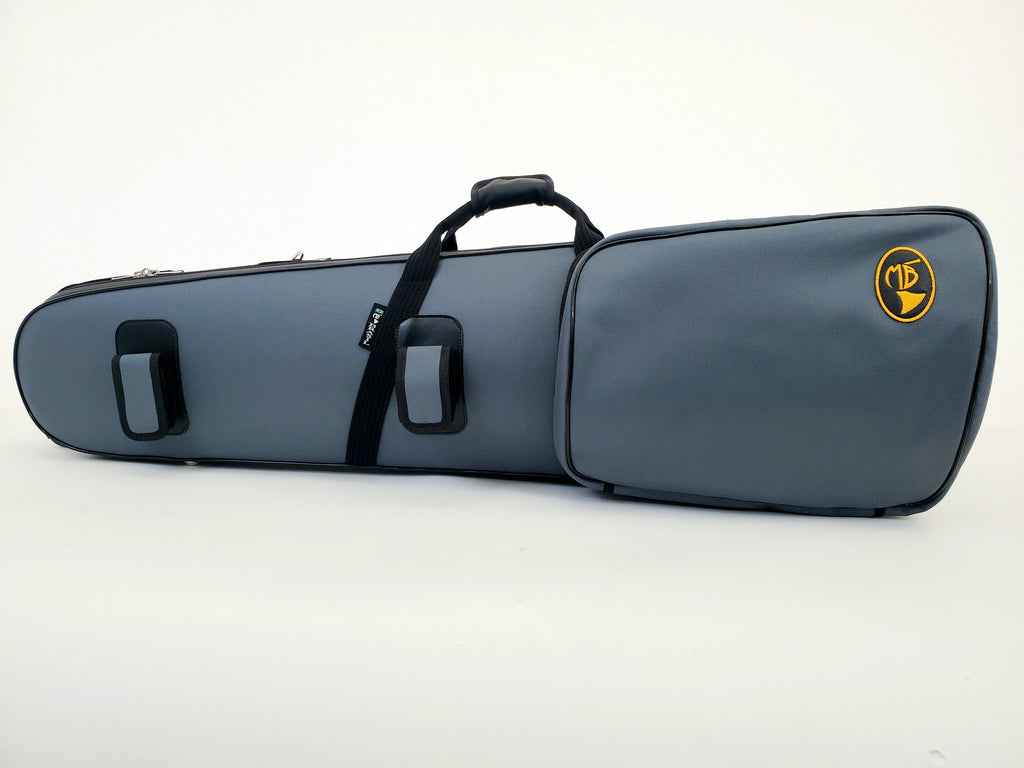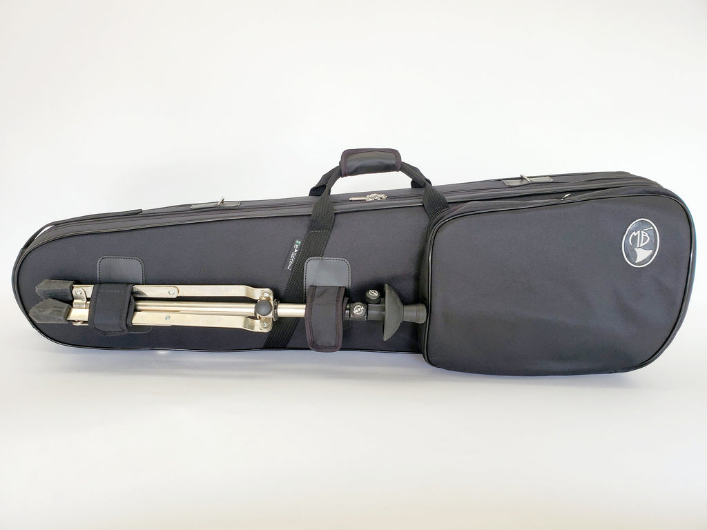 This case is slightly larger than other trombone offerings from Mr. Bonna, but it has several features of interest to the working trombonist. A standard mute, whether straight or cup or other variety, will fit inside your horn in the case. This adds some bell flare protection as well. If the trombone were to shift, the horn is supported by the mute deep inside the bell throat, rather that being supported by the thin flare. The case includes an external pocket large enough to hold most sheet music. Lastly, two external Velcro loops allow you to strap your trombone stand to the case. I think of the player on a classical job who only needs one mute and a stand, and a little sheet music. Since all these items go in the case, you save yourself carrying another piece of luggage.