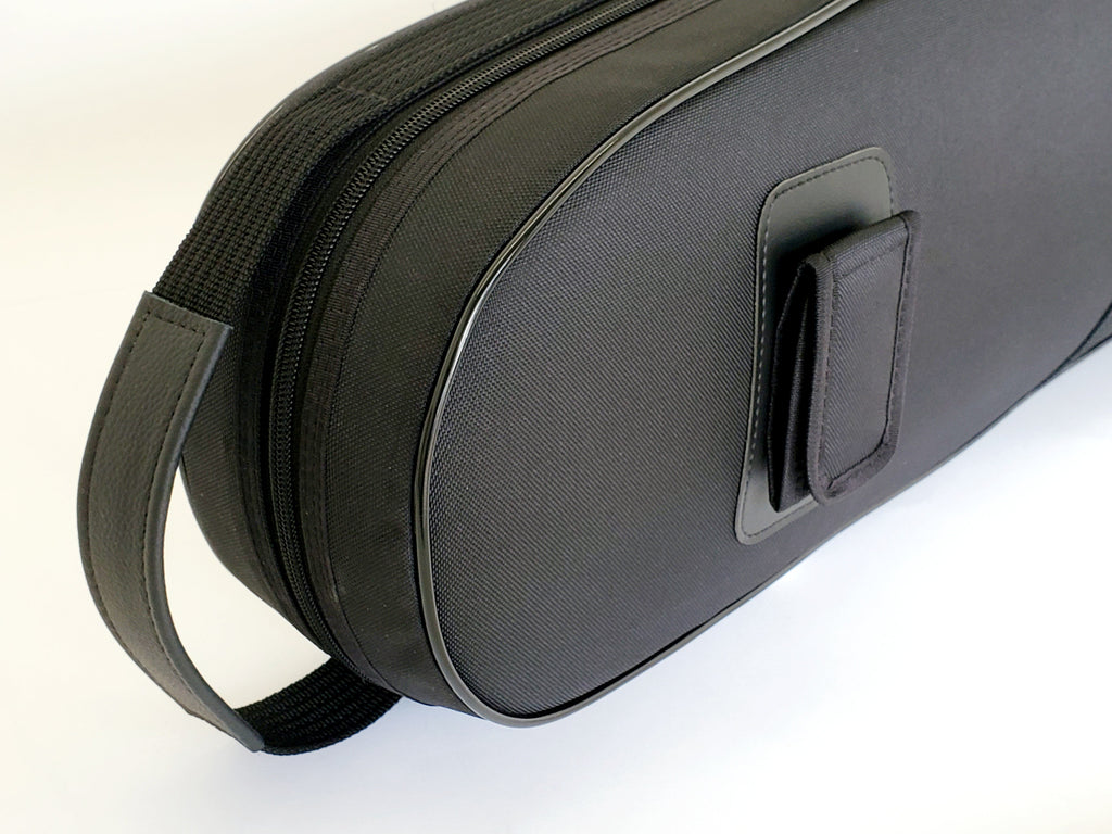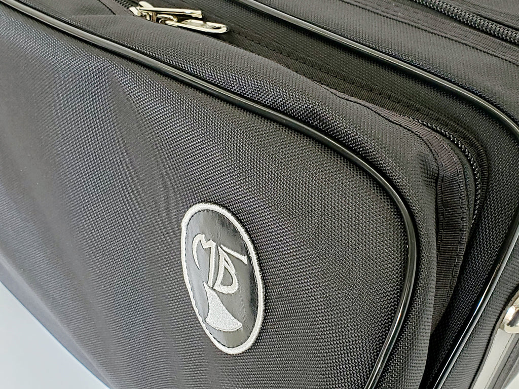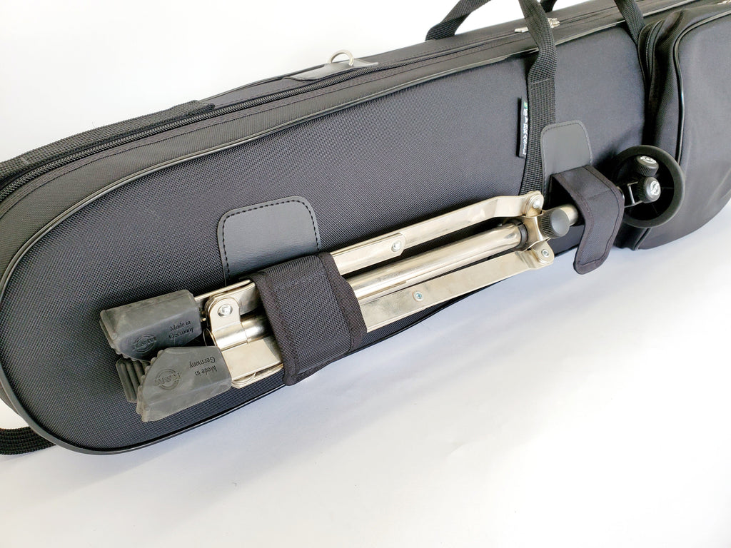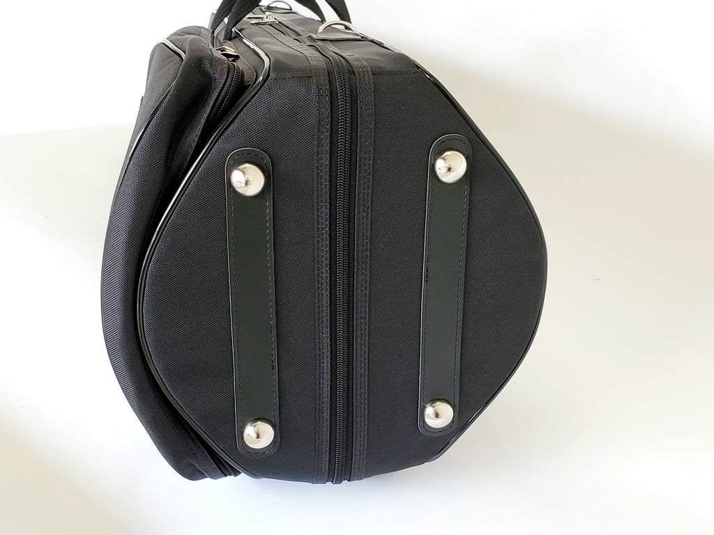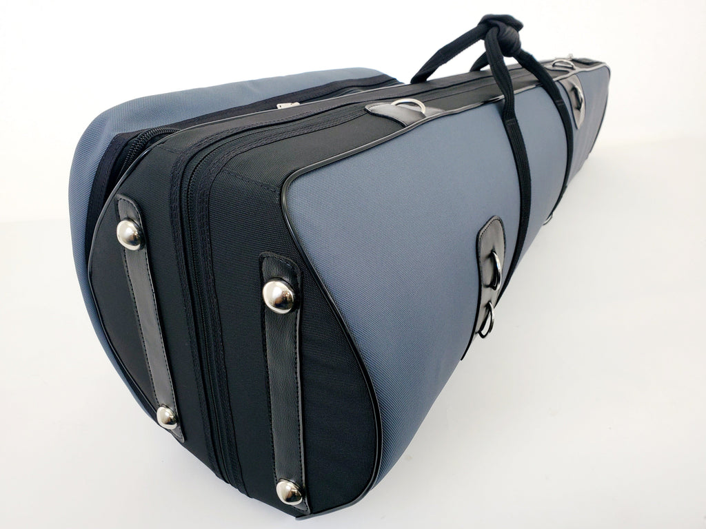 This case is slightly larger than other trombone offerings from Mr. Bonna, but it has several features of interest to the working trombonist. A standard mute, whether straight or cup or other variety, will fit inside your horn in the case. This adds some bell flare protection as well. If the trombone were to shift, the horn is supported by the mute deep inside the bell throat, rather that being supported by the thin flare. The case includes an external pocket large enough to hold most sheet music. Lastly, two external Velcro loops allow you to strap your trombone stand to the case. I think of the player on a classical job who only needs one mute and a stand, and a little sheet music. Since all these items go in the case, you save yourself carrying another piece of luggage.