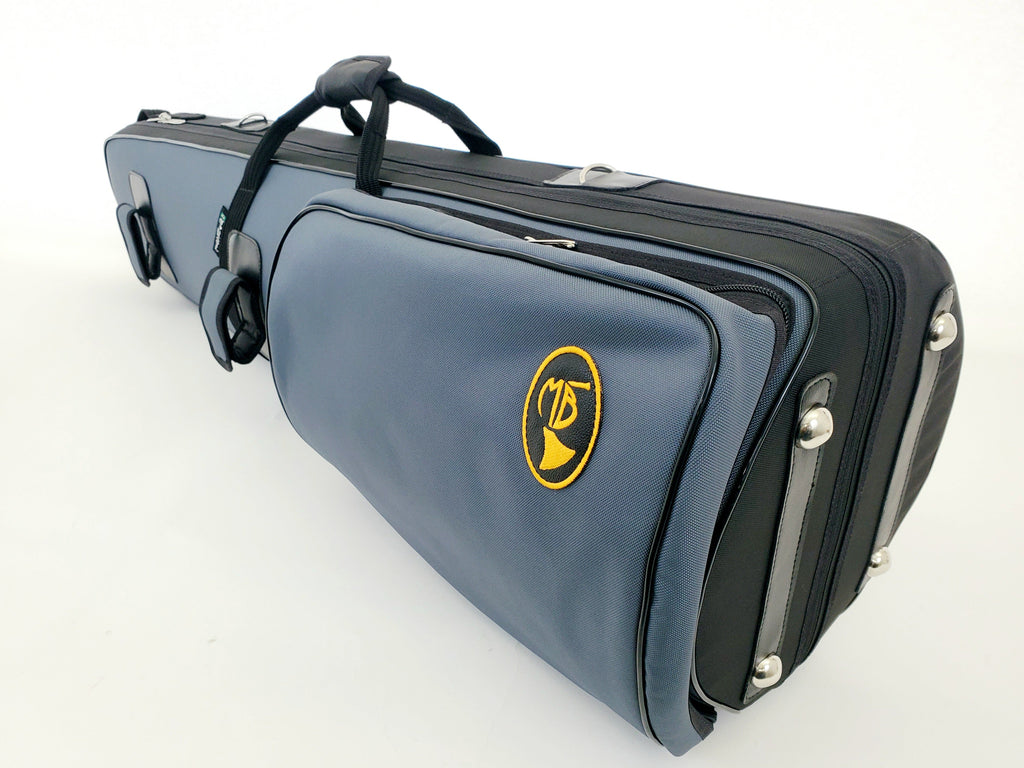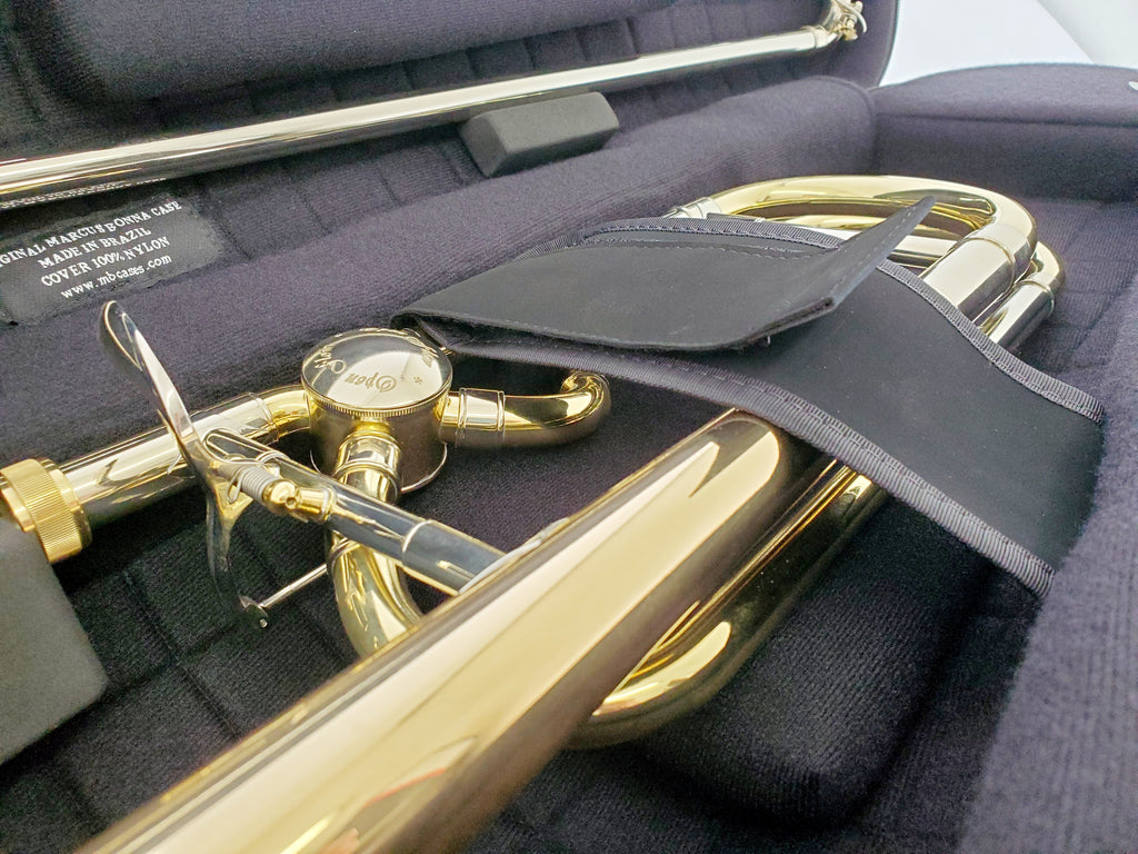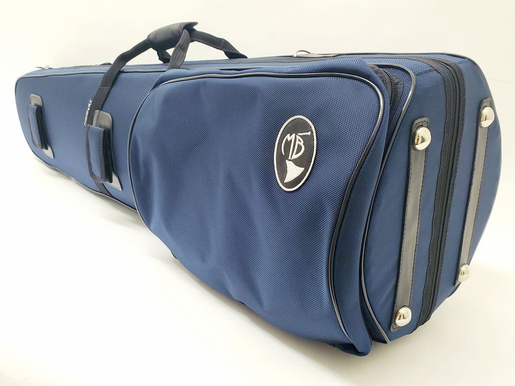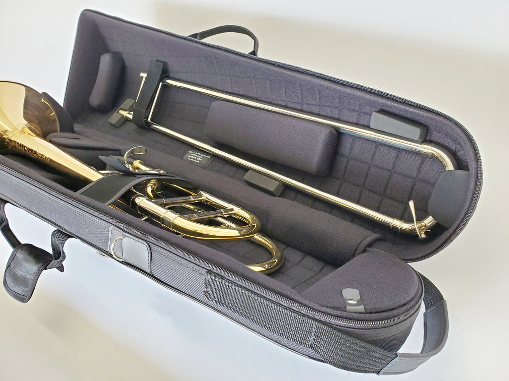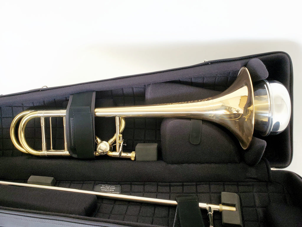 This is a lightweight fiberglass case for all tenor trombones. It is made by Marcus Bonna in Brazil. This is one of the premier cases for trombone, and it should last you forever. The outer cover is made of a high quality nylon, and the cover is easily removable if cleaning repair, or replacement is desired. Leather covers are available by special order. The fiberglass shell is padded inside and out. The interior has a variety of movable fabric covered foam pads which attach with Velcro, so you can customize the interior to your instrument. There is limited small accessory storage. Nearly any trombone should fit in this Bonna case. Straight tenor or tenor with F-attachment, up to a 9" bell. Open wrap, closed wrap, any rotor, Axial, Hagman, Trubore all seem to fit fine. The key is that both the hand slide and the bell section strap into opposite halves of the case. This prevents movement and holds the sections further away from each other. Heavy travelers might place a towel in between parts, but for daily use, no extra precautions should be necessary.