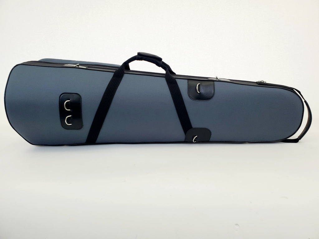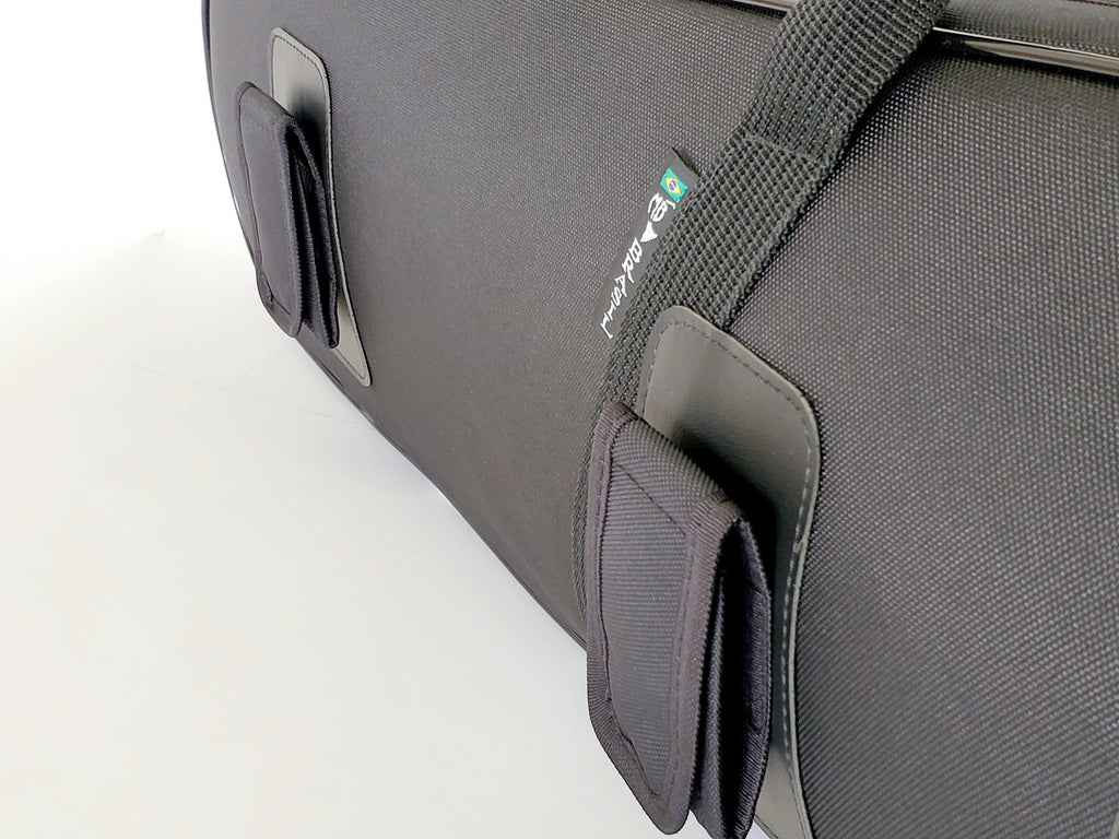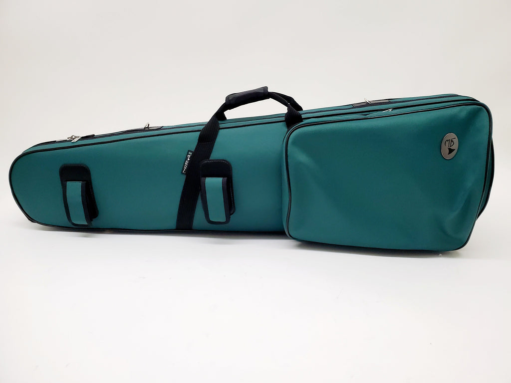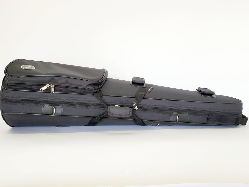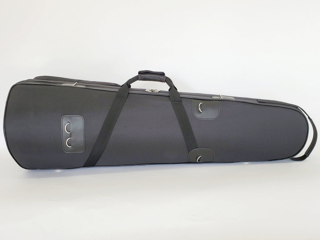 This is a lightweight fiberglass case for all tenor trombones. It is made by Marcus Bonna in Brazil. This is one of the premier cases for trombone, and it should last you forever. The outer cover is made of a high quality nylon, and the cover is easily removable if cleaning repair, or replacement is desired. Leather covers are available by special order. The fiberglass shell is padded inside and out. The interior has a variety of movable fabric covered foam pads which attach with Velcro, so you can customize the interior to your instrument. There is limited small accessory storage. Nearly any trombone should fit in this Bonna case. Straight tenor or tenor with F-attachment, up to a 9" bell. Open wrap, closed wrap, any rotor, Axial, Hagman, Trubore all seem to fit fine. The key is that both the hand slide and the bell section strap into opposite halves of the case. This prevents movement and holds the sections further away from each other. Heavy travelers might place a towel in between parts, but for daily use, no extra precautions should be necessary.