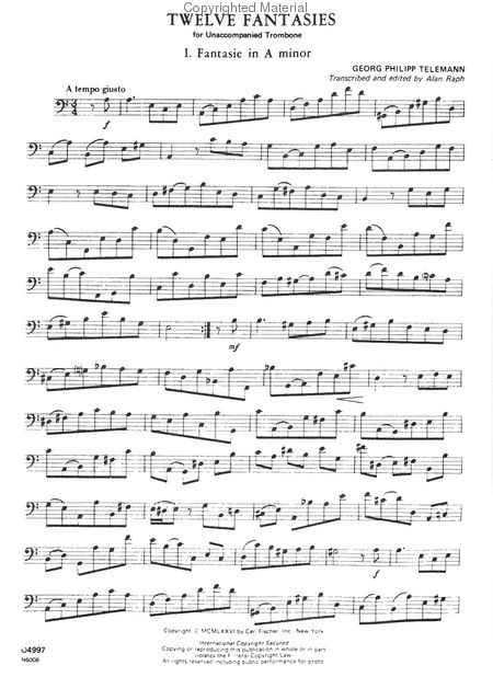 his wonderful collection holds a place in the literature alongside the Bach Cello Suites. Like the Bach suites, they represent in A Major composer's contribution to the literature of a solo instrument and are a valuable resource for study and performance. Unlike the Bach suites, these fantasies are composed for a wind instrument and thereby require little compromise on the part of the trombonist. Phrase-breathing is an inherent part of their construction, while double-stops are not. Seven of the "Twelve Fantasies" are in bass clef, five are in tenor clef. All are playable on the tenor trombone, although some of them favor the lower register and will sound well on the bass trombone.