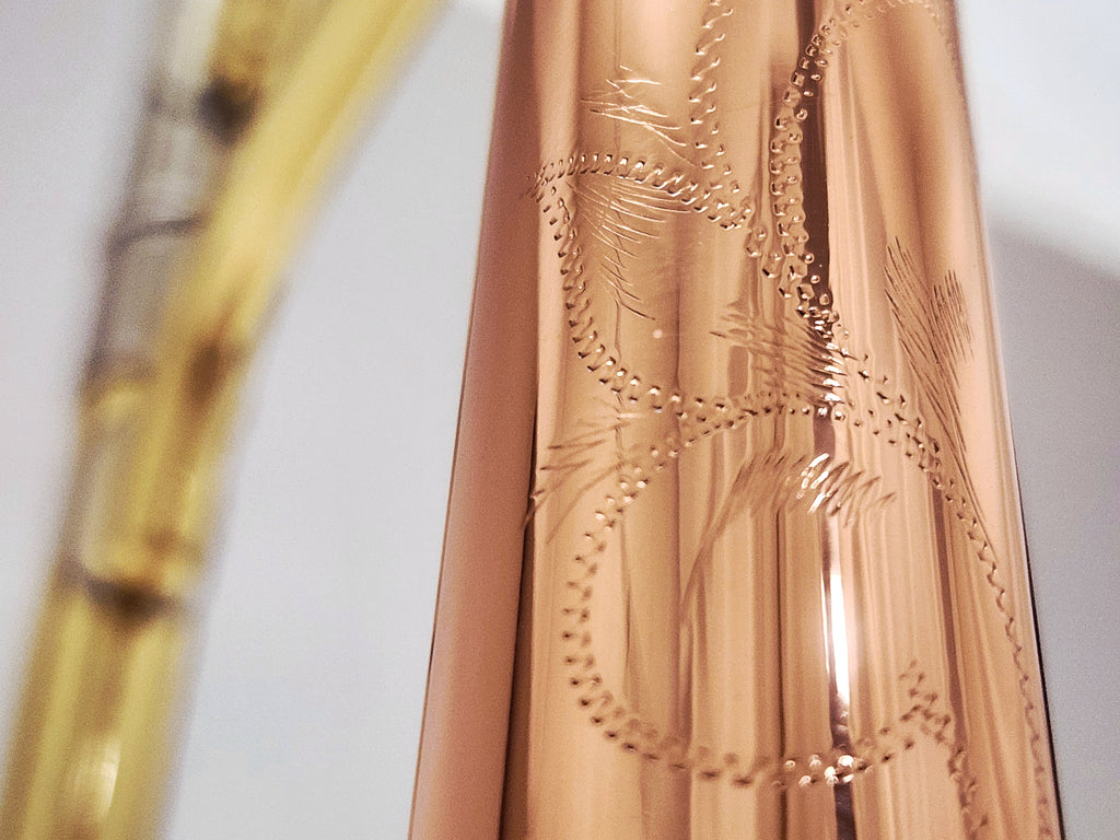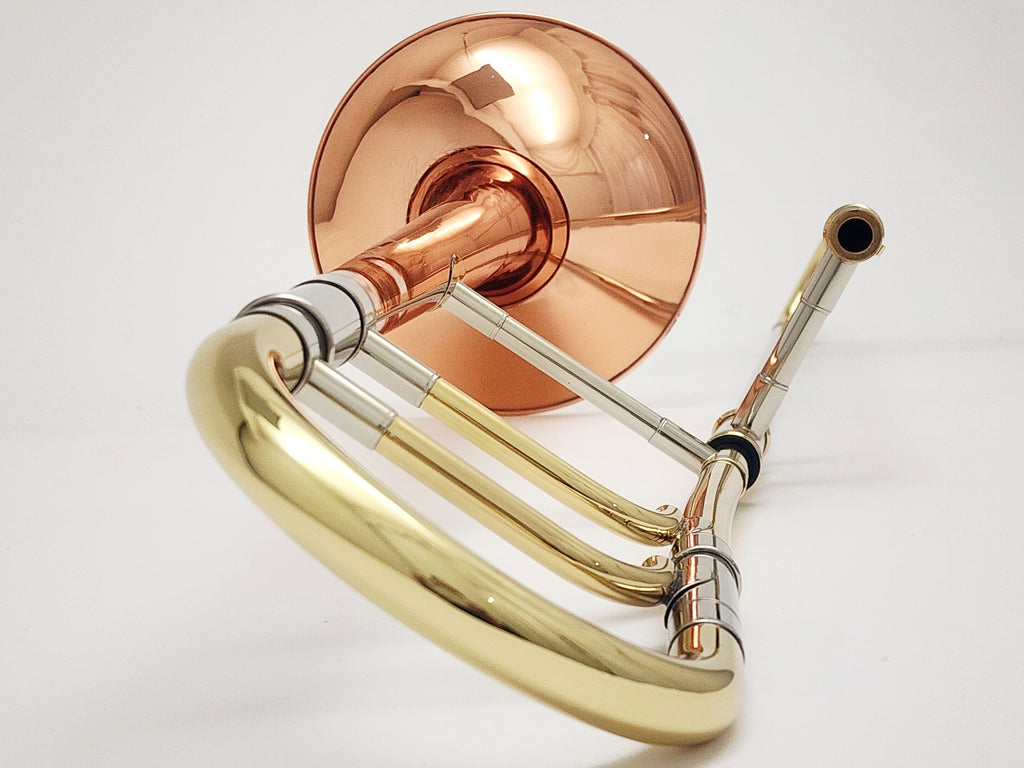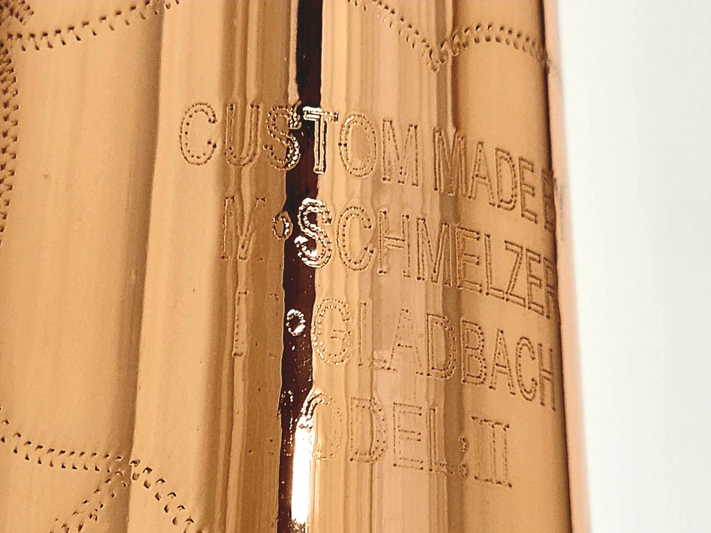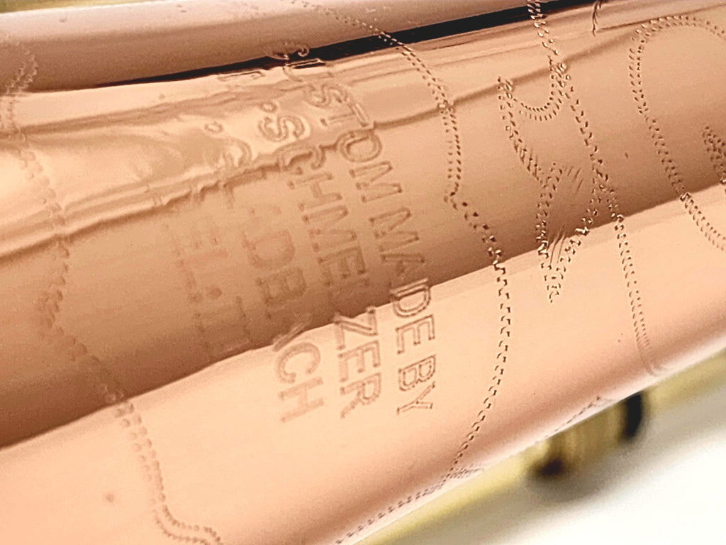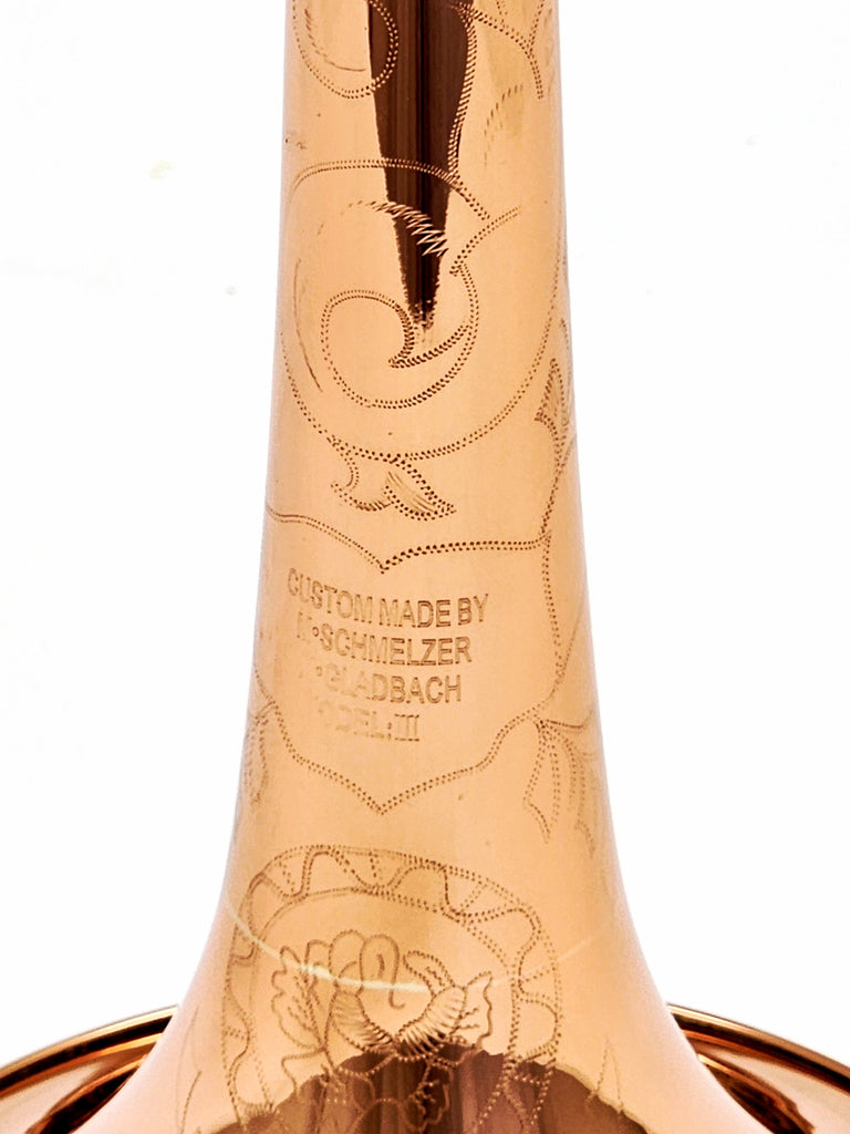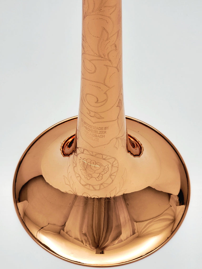 From the collection of Manfred Schmelzer, this is a .525" medium bore trombone with a copper bell. The bell features ornate hand engraving. Fits small shank mouthpiece. Manfred is one of the premier custom trombone builders of Germany who is retiring this year.