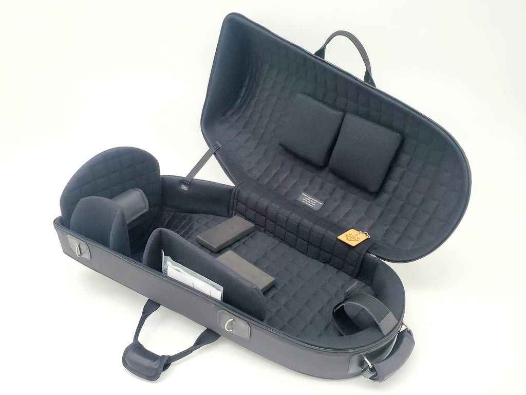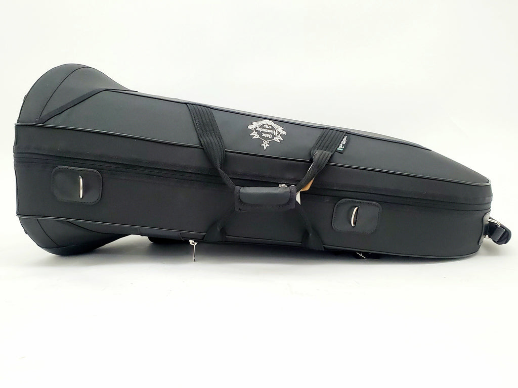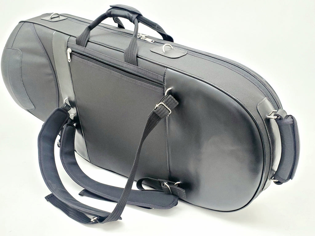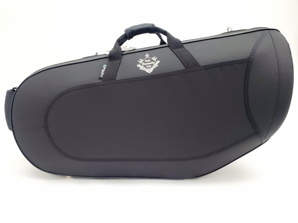This is a fiberglass case made by Marcus Bonna in Brazil and imported from Alexander in Germany. This case is designed to fit the Alexander model 151 Bb tenor tuba. Feature black nylon outer cover with leather trim, black interior, and bottom bow strap to stabilize the horn inside the case. Includes backpack straps,, shoulder strap, mouthpiece pouch.